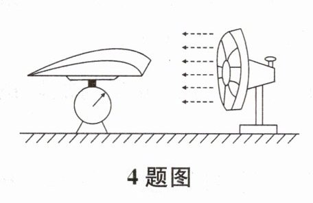 4. 如图所示,飞机机翼模型静立在台秤上,当用电风扇对着模型吹风时,台秤的示数比没有吹风时小,这说明模型上表面比下表面空气的流速