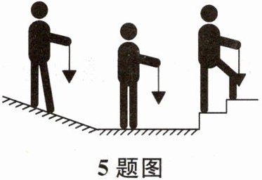 5. 如图所示,小明提着用一根细线拴着的重物先下坡,再经过一段平直路面,最后沿阶梯走上高处,三个路段细线均处于相同的情形,是因为重力的方向总是