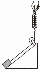 5. 如图所示,一固定斜面顶端装有定滑轮,为测量该装置提升物体时的机械效率,用弹簧测力计连接细绳,跨过定滑轮将重为6N的物体沿斜面向上匀速拉动0.6m,物体上升的高度为0.3m,弹簧测力计的示数为4N.求: