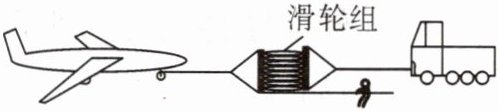 9. 某节目中展现了一个力学奇迹:8 岁小孩借助滑轮组拉动了一架重约 6 t 的飞机. 如图所示是当时所使用的装置,卡车固定不动,滑轮组由八对滑轮组成,小孩拉动绳子自由端的拉力是 100 N,他在 80 s 内将飞机匀速拉动了 1 m,绳子自由端移动了 16 m,飞行匀速运动时摩擦阻力为自身重力的 $ \frac{1}{50} $,g 取 10 N/kg. 求: