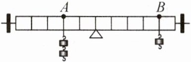 6. 如图所示,每个钩码的质量为 50 g,在均匀杠杆的 A 处挂 2 个钩码,B 处挂 1 个钩码,杠杆恰好水平平衡. 在 A、B 两处再各加 1 个钩码,那么 (