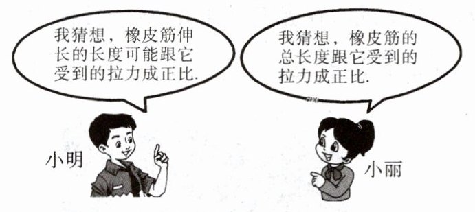 10. 在“制作一个橡皮筋测力计”的活动中,小军提出一个问题:“在一定的弹性范围内,橡皮筋伸长的长度跟它受到的拉力可能存在什么关系?”小明和小丽经过思考后的猜想如图所示,究竟谁的猜想正确呢?他们决定一起通过实验来验证自己的猜想.