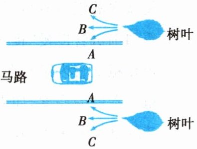 4. 我们经常看到这样的现象:在无风的天气,汽车在马路上快速驶过以后,马路两边的树叶会随风飘动,如图所示,汽车向左行驶,马路两边的树叶会沿着A、B、C哪一个方向飘动(