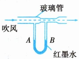 1. 如图所示的装置上方为一个粗细不均匀的两头开口的玻璃管,管下连通一个装有红墨水的U形管AB。当用吹风机向玻璃管中吹风时,出现的现象是(