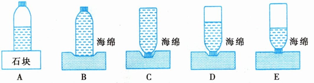 9. 在探究“压力的作用效果与哪些因素有关”实验中,小聪在平底的矿泉水瓶中装水后,分别放在海绵和砖块上进行实验,实验过程中的情景如图A、B、C、D、E所示(已知B、C两图中瓶内的水是满的)。