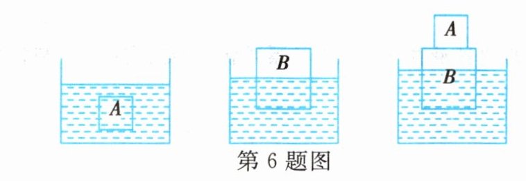 6. 如图所示,将物体$A$放入冰中时悬浮,将物体$B$放入水中时有一半的体积露出水面,将物体$A$置于物体$B$上再放入水中时,物体$B$有三分之一的体积露出水面,则两物体的体积之比$V_{A}:V_{B}=$