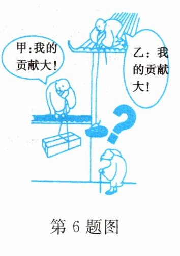 6. 如图所示,在整修寺庙的过程中,甲和尚将一块重400N的石头提到2m高的庙墙上,乙和尚把重110N的瓦片提到6m高的房檐上。请帮助老和尚比较甲、乙两个和尚的贡献大小。