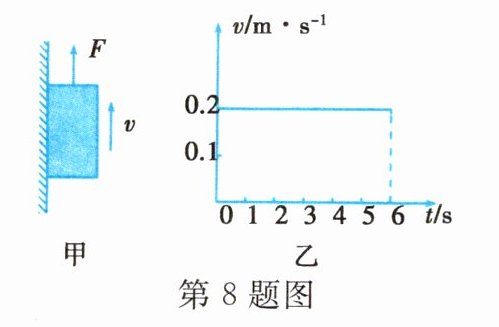 8. 如图甲所示的铁块重力G=4N。被吸附在竖直放置且足够长的磁性平板上。当它在竖直方向上F=6N的拉力作用下向上运动时。速度v与时间t的关系图象如图乙所示。则铁块受到的摩擦力为