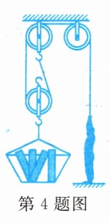 4. (多选)一位建筑工人要把建筑材料运送到楼上,他使用了如图所示的装置进行升降,已知吊篮的质量为$m_{1}$,建筑材料的质量为$m_{2}$,人对绳子的拉力为 F,吊篮在拉力的作用下匀速上升了 h,不计绳重和摩擦。下列表述正确的是 (