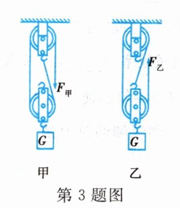 3. 分别用如图所示的甲、乙两个滑轮组,在 10 s 内将重为 40 N 的物体 G 匀速提升 1 m,每个滑轮的重均为 20 N,不计绳重及摩擦,下列有关说法正确的是 (