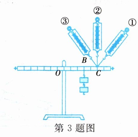3. 如图是小明探究“杠杆平衡条件”的实验装置,实验中杠杆始终处于水平平衡状态。若在$C$处逐渐改变弹簧测力计拉力的方向,使其从①→②→③,则拉力的变化情况是(