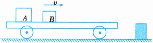 6. 如图所示,上表面水平且光滑的小车上有A、B两个物体,两物体与小车以相同的速度一起向右匀速运动。B在A的正前方,B的质量小于A的质量。假设小车的上表面足够长,不计空气阻力,小车遇到障碍物突然停止后,A、B两物体