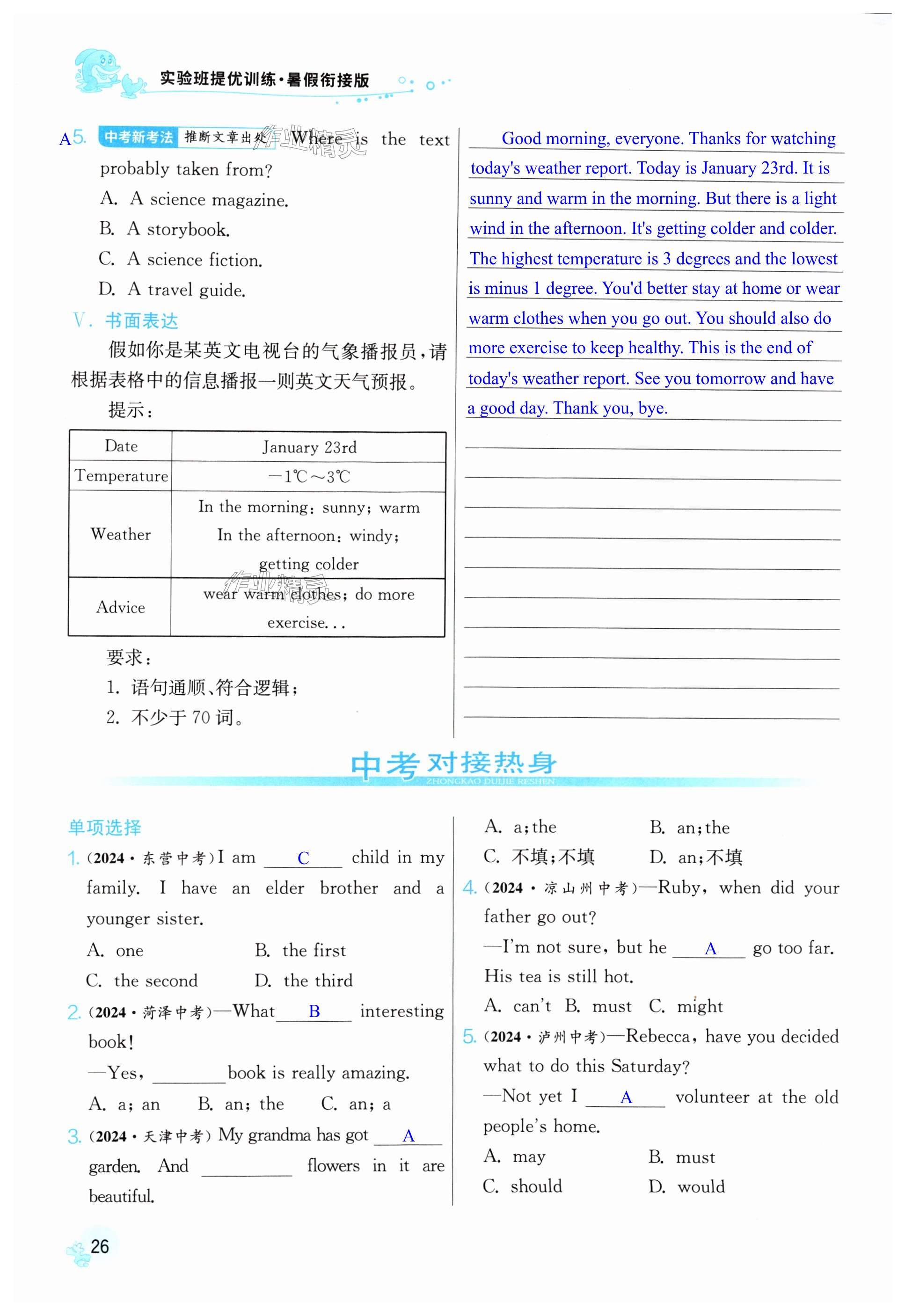 注:目前有些书本章节名称可能整理的还不是很完善,但都是按照顺序排列的,请同学们按照顺序仔细查找。练习册 2025年实验班提优训练暑假衔接版八升九年级英语外研版 答案主要是用来给同学们做完题方便对答案用的,请勿直接抄袭。