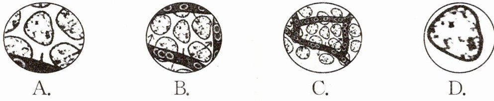 9. 若用一台显微镜观察同一标本四次,每次仅调整目镜、物镜和细准焦螺旋,结果得到下列各图,其中视野最暗的是 …………………………………… (