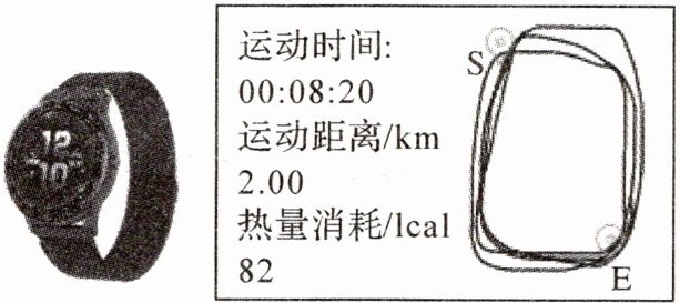 (2)由图可知,佩戴者运动的时间和距离分别为t=8min20s=500s,s=2km=2000m,运动速度:$v=\frac{s}{t}=\frac{2000m}{500s}=4m/s$。