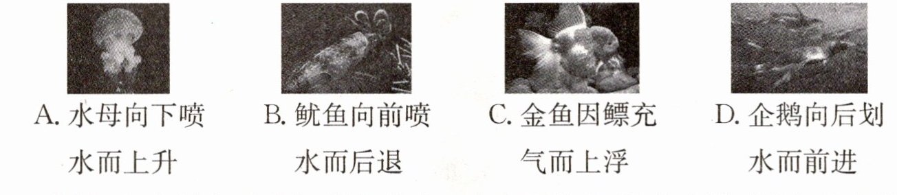 分析:A. 水母向下喷水,施加给水一个向下的力,那么水同时施加给水母一个向上的力,使它上升,故A不合题意;B. 鱿鱼向前喷水,施加给水一个向前的力,那么水同时施加给鱿鱼一个向后的力,使它后退,故B不合题意;C. 金鱼给鱼鳔充气,增大排开水的体积,根据阿基米德原理$F_{浮}=ρ_{液}gV_{排}$可知,它受到的浮力增大而上浮,与力的作用的相互性无关,故C符合题意;D. 企鹅向后划水,施加给水一个向后的力,那么水同时施加给企鹅一个向前的力,使它前进,故D不合题意。