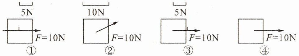 分析:A. ①中力没有作用在物体上,故A错误;B. ②中力的方向不是水平向右的,故B错误;C. ③中的力作用在物体上,方向水平向右,大小为10N,故C正确;D. ④中没有标度,无法确定力的大小,故D错误。