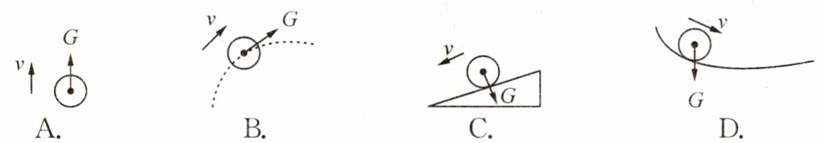 解题总结:重力的方向总是竖直向下的,不随运动状态改变而改变,分别观察A、B、C、D四图中所标重力的方向,看重力方向是否竖直向下。
