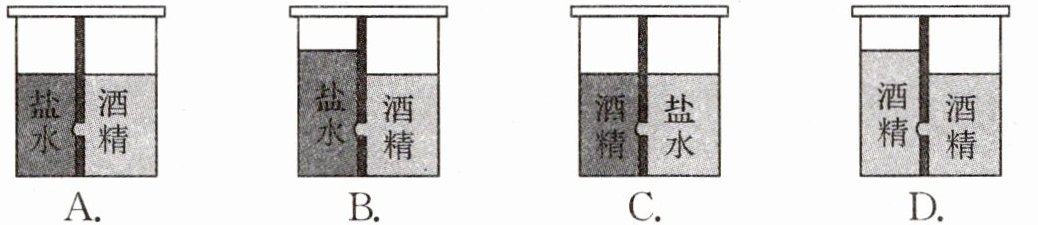 分析:A. 隔板两侧液体的密度不同,深度相同,左侧盐水密度大,由 $ p = \rho gh $ 可知,左侧盐水产生的压强大,橡皮膜应向右侧凸出,故A错误;B. 隔板两侧液体的密度不同,深度不同,左侧盐水密度大且深度大,由 $ p = \rho gh $ 可知,左侧盐水产生的压强大,橡皮膜应向右侧凸出,故B错误;C. 隔板两侧液体的密度不同,深度相同,右侧盐水密度大,由 $ p = \rho gh $ 可知,右侧盐水产生的压强大,橡皮膜应向左侧凸出,故C正确;D. 隔板两侧液体的密度相同,深度不同,左侧酒精深度大,由 $ p = \rho gh $ 可知,左侧酒精产生的压强大,橡皮膜应向右侧凸出,故D错误。