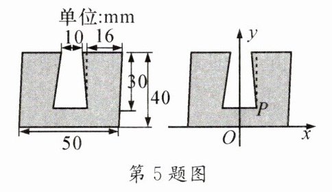 5. 小明画一个零件的轴截面,以该轴截面底边所在的直线为 $ x $ 轴,对称轴为 $ y $ 轴,建立如图所示的平面直角坐标系. 若坐标轴的单位长度取 $ 1 \mathrm { mm } $,则图中点 $ P $ 的坐标表示正确的是 …………………………………………………(