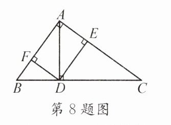 8. 如图所示,在Rt△ABC中,AC≠AB,AD是斜边BC上的高,DE⊥AC,DF⊥AB,垂足分别为E,F,则图中与∠C相等的角有 …………………… (