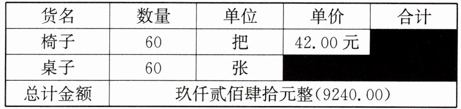 解:设桌子的单价为 $x$ 元。$60 \times 42 + 60x = 9240.00$ $x = 112.00$ 椅子总价:$60 \times 42.00 = 2520.00$(元) 桌子总价:$60 \times 112.00 = 6720.00$(元)