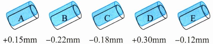 (1) 零件 A 的误差的绝对值为$|+0.15|=0.15<0.2$,合格;零件 B 的误差的绝对值为$|-0.22|=0.22>0.2$,不合格;零件 C 的误差的绝对值为$|-0.18|=0.18<0.2$,合格;零件 D 的误差的绝对值为$|+0.30|=0.30>0.2$,不合格;零件 E 的误差的绝对值为$|-0.12|=0.12<0.2$,合格。答:这五个零件中,不合格的零件为零件 B 和零件 D。