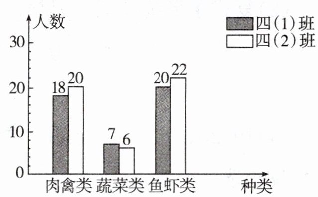 (3)喜欢吃鱼虾类的总人数是四(2)班喜欢吃蔬菜类人数的