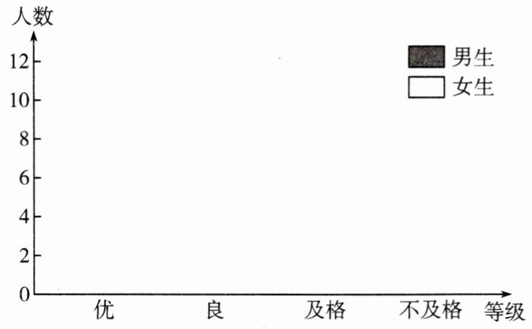 (1) 按照统计表中男生、女生各等级人数,在统计图中对应等级画出相应高度的直条(男生优对应到$10$,良对应到$9$,及格对应到$4$,不及格对应到$2$;女生优对应到$8$,良对应到$11$,及格对应到$7$,不及格对应到$1$)。