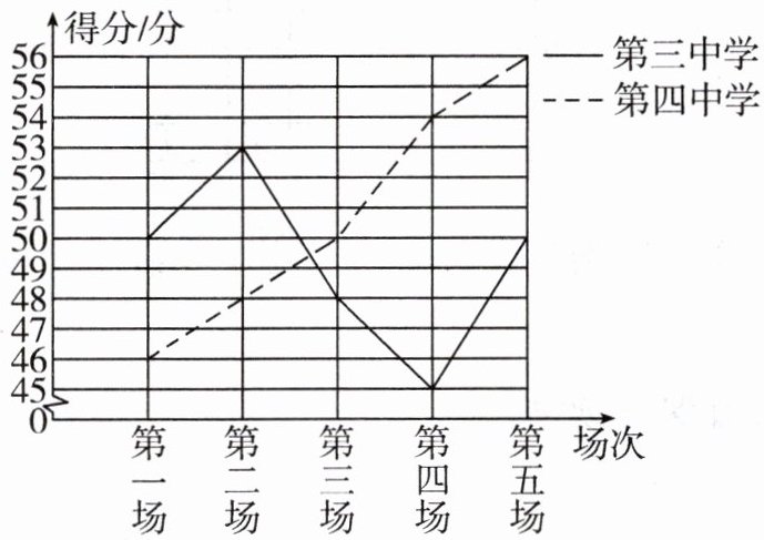 3. 下面是某市第三中学和第四中学篮球队五场比赛的得分情况统计图,根据统计图回答问题。