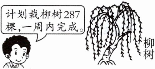 【解析】:一周有$7$天,已知要栽柳树$287$棵且一周内完成,求平均每天栽的棵数,就是把$287$平均分成$7$份,求每份是多少,用除法计算,即$287\div7 = 41$(棵)。