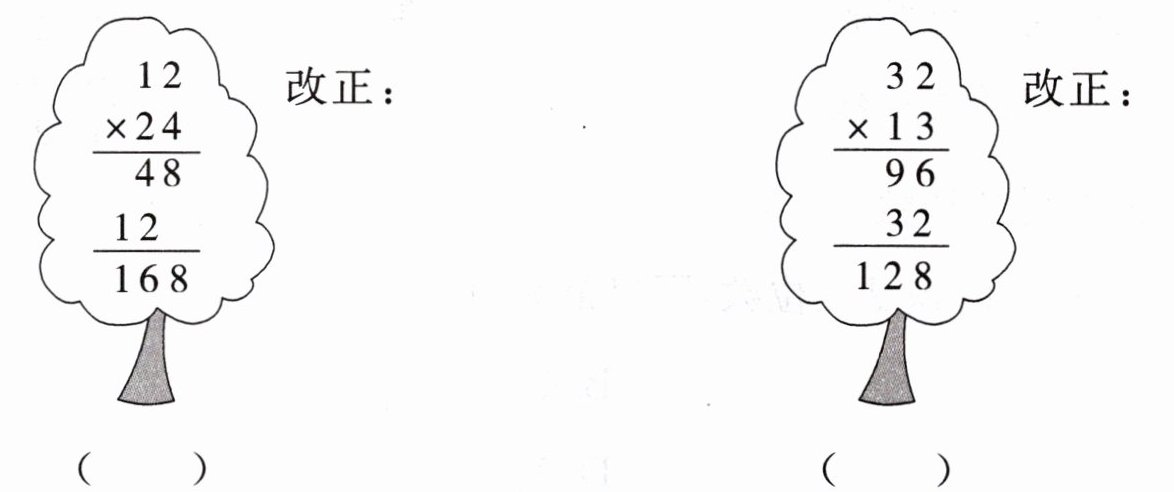 【解析】:第一个竖式计算错误,$12\times24$,先算$12\times4 = 48$,再算$12\times20 = 240$,最后$48 + 240 = 288$。