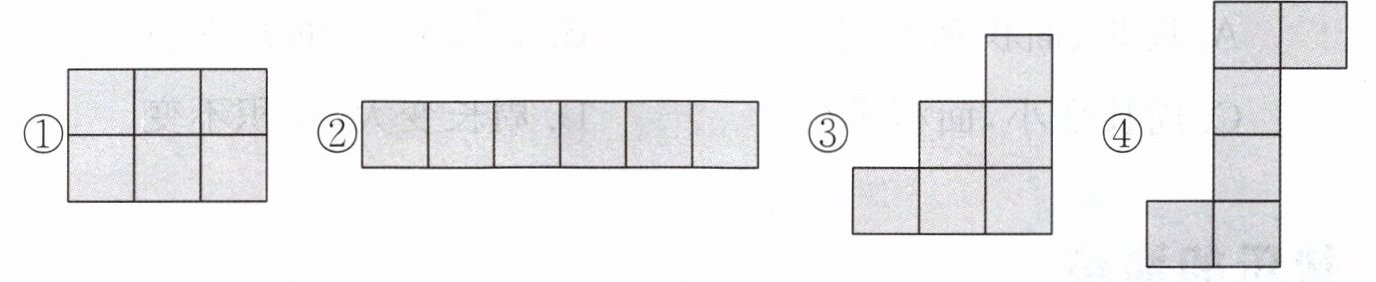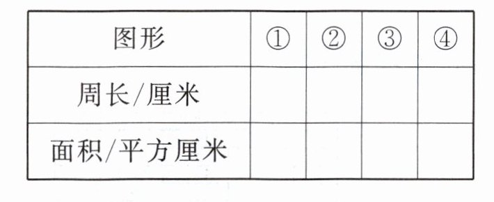 - 对于图形①:长是$3$厘米,宽是$2$厘米。根据长方形周长公式$C=(a + b)\times2$($a$为长,$b$为宽),可得周长$(3 + 2)\times2=10$厘米;面积是$6$个小正方形面积之和,$1\times6 = 6$平方厘米。