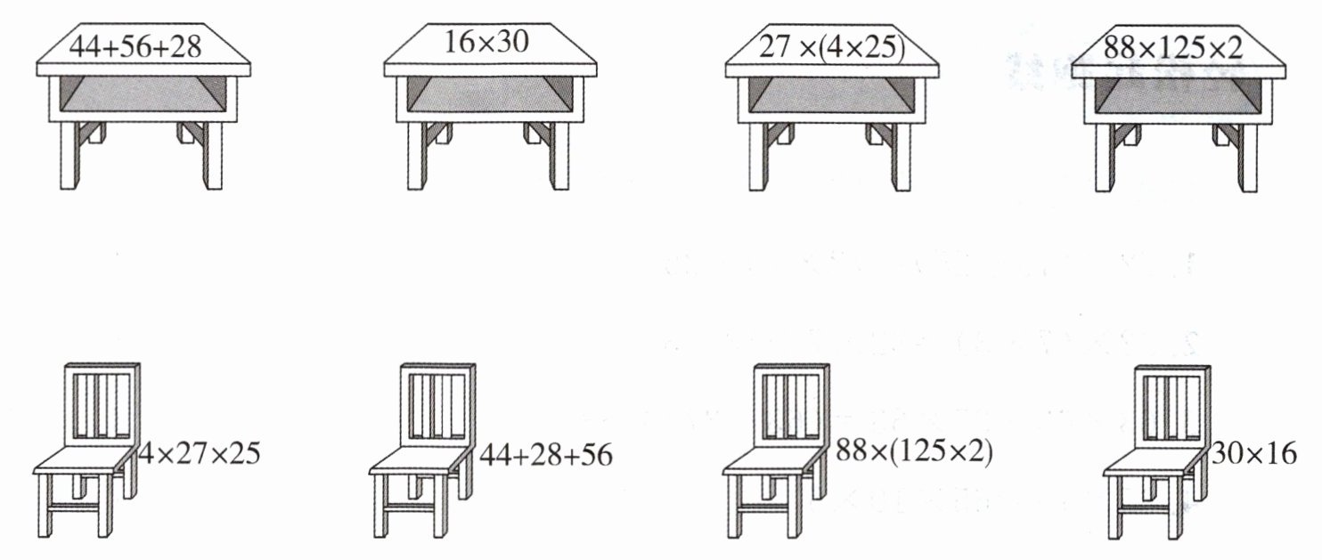 【答案】:$44 + 56 + 28$连$44 + 28 + 56$;$16×30$连$30×16$;$27×(4×25)$连$4×27×25$;$88×125×2$连$88×(125×2)$。