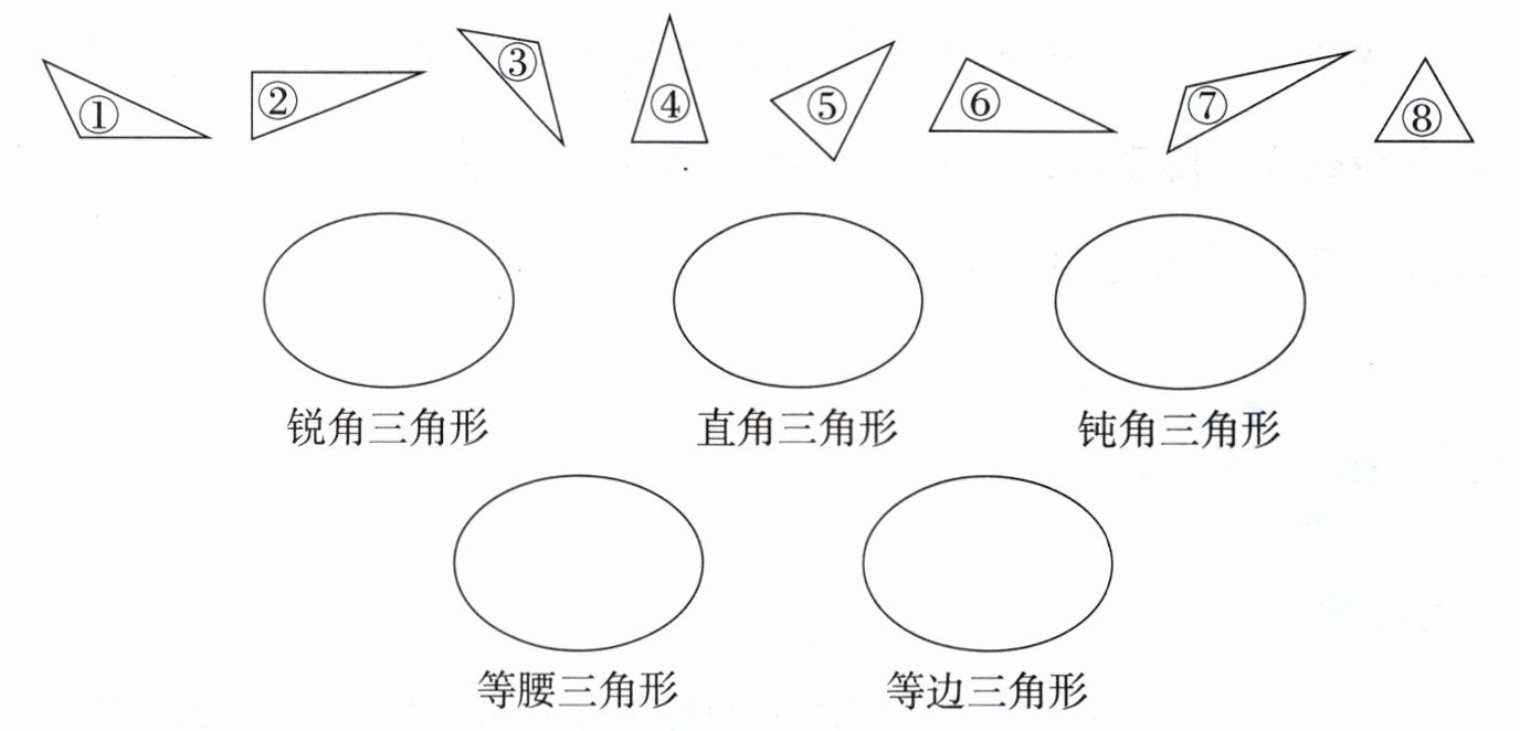 - 锐角三角形:三个角都为锐角(小于$90^{\circ}$)的三角形。$④⑤⑧$的三个角都是锐角,所以是锐角三角形。