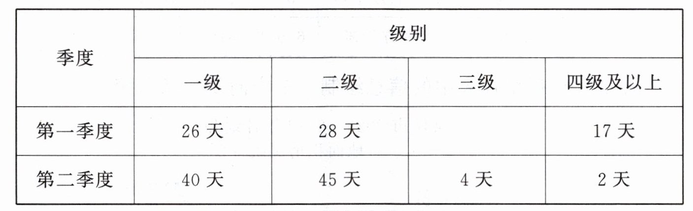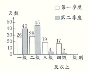 4. 这两个季度中,( )级的天数相差最多,( )级的天数相差最少。