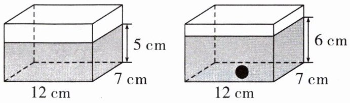 【解析】:铁球的体积等于它放入长方体容器后,水面上升部分的体积。水面上升的高度为$6 - 5 = 1$(cm),根据长方体体积公式$V = 长×宽×高$,可得铁球体积为$12×7×(6 - 5)= 12×7×1 = 84$($cm^{3}$)。