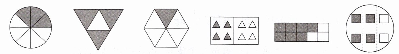 - 对于$\frac{3}{4}$:把$8$个苹果看作一个整体,平均分成$4$份,每份$8\div4 = 2$个,涂其中$3$份($2\times3 = 6$个苹果)。