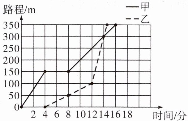 (2)甲在2 - 8分钟路程不变,说明在休息,休息时间为$8 - 2 = 6$分钟。
