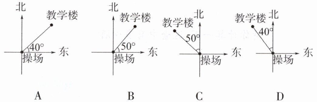 以操场为观测点,教学楼在北偏东$50^{\circ}$的方向上,下图中正确的是(
