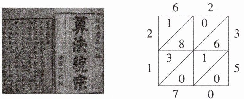 如计算$62×35$,先把乘数分别写在方格的上面和右面,然后把一个乘数各位上的数分别和另一个乘数各位上的数相乘。积写在相应的方格里。像 6 乘 3 得 18,写在左上方格里再把斜对着的数分别相加,就得到相乘的积 2170。你能尝试用这样的方法计算$24×51$吗?