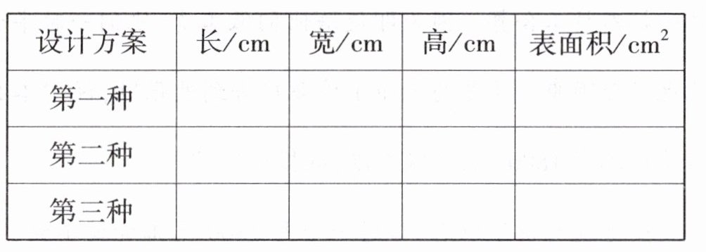 2. 礼品店要将三个礼盒打成一大包,其中,每个礼盒长 10 cm,宽 6 cm,高 2 cm。你能设计出几种包装方法?分别算出不同方法需要包装纸大小,并对比一下哪种包装更节约。