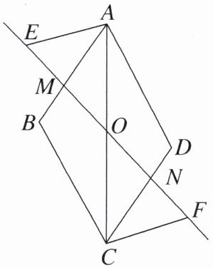 19. 如图,$□ ABCD$中,$O$为对角线$AC$的中点,过点$O$作一条直线分别与$AB$,$CD$交于点$M$,$N$,点$E$,$F$在直线$MN$上,且$OE = OF$.