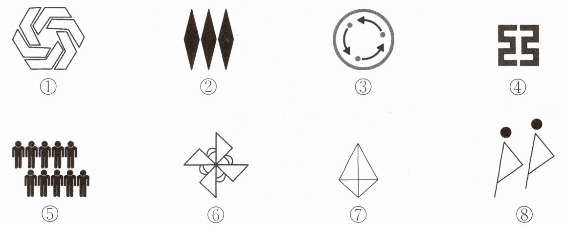 由平移得到的是(②⑤⑧),由旋转得到的是(①③⑥),由轴对称得到的是(④⑦)。