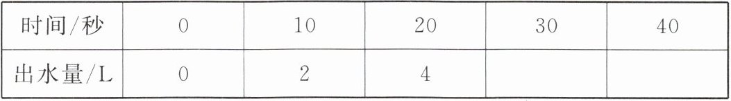 1. 观察表格可知,每$10$秒出水量增加$2L$,所以$30$秒时出水量为$6L$,$40$秒时出水量为$8L$。