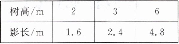 (2)根据表格中的数据,在方格纸上找到对应的点(树高为横坐标,影长为纵坐标),即$(2,1.6)$、$(3,2.4)$、$(6,4.8)$,然后顺次连接这些点。(此步骤为画图操作,文字描述原理)