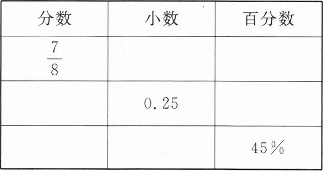- 小数$0.25$化成分数,$0.25=\frac{25}{100}=\frac{1}{4}$;化成百分数,$0.25×100\% = 25\%$。