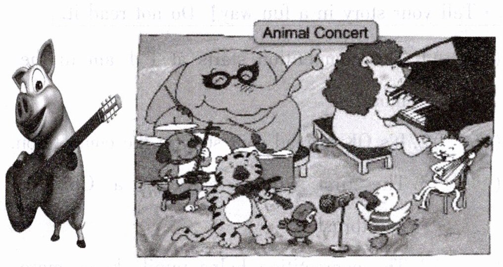 I'm a pig. I like music very much. We had a concert last week. The bird sang and the duck 1. ______. The lion played the 2. ______. The cat played the 3. ______. The elephant played the 4. ______. The dog played the 5. ______. The tiger played the 6. ______. And I played the 7. ______.
