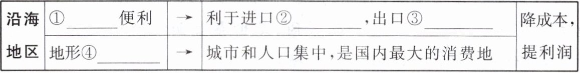 (4) 小明通过下表来说明日本工业临海分布的原因,请将其补充完整。
