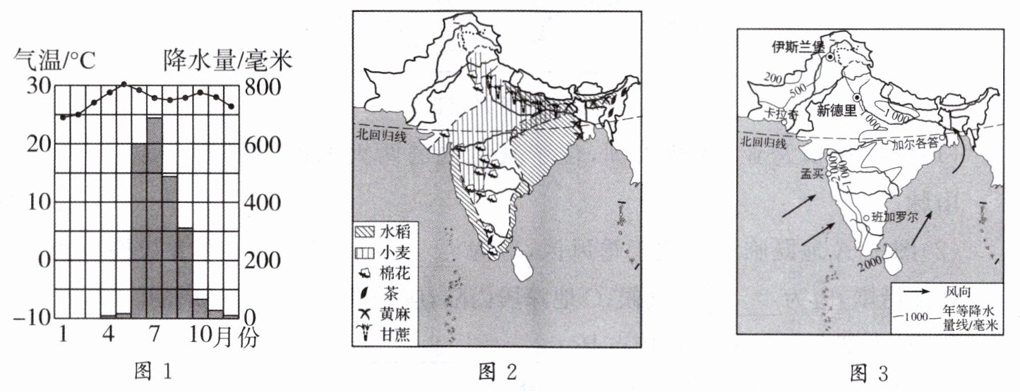 11. 根据老师提供的“孟买气温曲线和降水量柱状图”(图1)、“南亚农作物分布图”(图2)和“南亚主要风向和降水量分布图”(图3),某学习小组开展了主题为“热带季风气候对南亚农业生产的影响”的学习活动,请帮助该小组完成下列任务。
